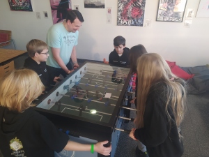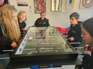 Nun waren wir buchstäblich im Keller angelangt, denn die Bretter 17-20 spielten nicht im großen Saal, sondern in einem kleinen Nebenraum, zu dem man einige Stufen herabsteigen musste. Gegen das Schachzentrum Bemerode wollten wir die Trendwende schaffen und zunächst sah es auch gut aus. Zwar verlor Ava an Brett 4 bei einer längeren Abwicklung die Übersicht bei der Materialzählung (die vermeintliche Mehrfigur entpuppte sich plötzlich als Minusqualität), dafür entwickelten sich die Bretter 1-3 sehr erfreulich für uns. Nun allerdings beging ich als Betreuer einen entscheidenden Fehler: Ich teilte die positive Entwicklung über unsere teaminterne WhatsApp-Gruppe mit, und prompt kippten natürlich alle Partien: Fiete verwandelte sein vorteilhaftes Turmendspiel mit wenigen Blitzzügen in eine rauchende Ruine, Luan stellte seinen Mehrbauern ein und verpasste im Bauernendspiel auch noch das Remis, und Christophe verpasste den K.o.-Schlag und ließ seinen Gegner zurück in die Partie, die dann natürlich auch noch verloren ging. Statt dem erhofften 3:1 also ein ernüchterndes 0:4 und das Zwischenfazit, dass vor dem Turnier offensichtlich mehr Endspieltraining gut getan hätte. Die Spieler ließen sich zum Glück nicht lange die Laune verderben und fanden Zerstreuung bei Tischfußball und Krimispiel.